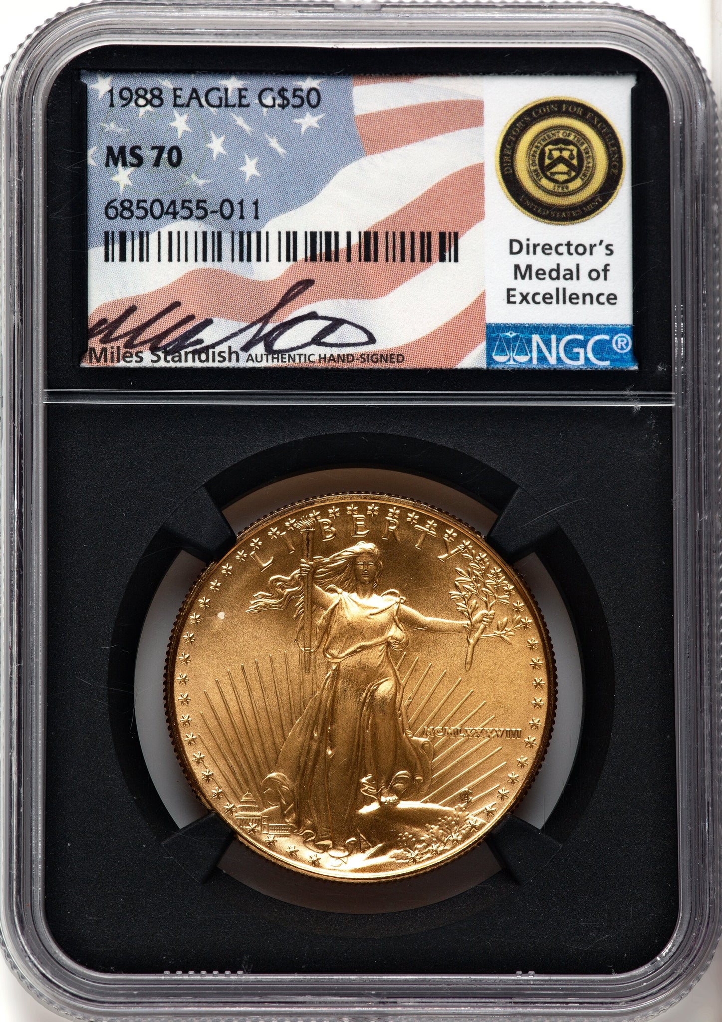 With a perfect MS70 grade, an early-year issue status, and a hand-signed label by renowned numismatist Miles Standish, this 1988 $50 Gold Eagle is an exceptional addition to any elite collection. Its historical significance, investment appeal, and flawless condition make it a highly sought-after piece in the Gold Eagle series. Don’t miss the opportunity to own this numismatic treasure!